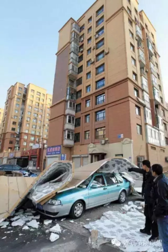 上个月,城东区某小区外墙保温层突然脱落,导致停放在楼下的两辆轿车不同程度受损。本报记者在现场采访时看到,坠落墙体位于该高层楼房第10层的位置,面积达4平方米以上。坠落物直接造成停放在楼下的一辆小轿车后风挡玻璃完全破碎,一辆出租车车头部分出现变形。